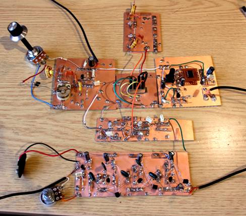 It turned out that it wasn’t nearly as complicated as it looked from the circuit diagram. Which is NOT to minimise the years of work & study KK7B had put into it! Also, as the design was 25 years old, most of the components were quite normal analogue items that even I could understand. SO BE IT! We gradually bought in the components, taking care to find exactly the same ones as stipulated in the article. Happily, all were still available. Also, the circuit is laid out in logical modules, each of which could be prototyped and tested separately. A printed circuit board had been made available in 1992, and the resulting receiver was commendably small. But I have very big clumsy hands, so it was decided to employ ugly construction on rectangles of printed circuit board, just like at the top of this page; and though the receiver would come out quite large, I didn’t think that would much affect the performance. We shall see!