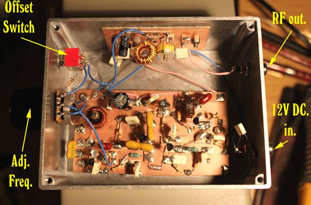 Well then. It was simply a matter of drilling a few holes in the magnificent (and not really terribly expensive) die-cast aluminium box we ordered a couple of days ago, and mounting all inside. It is always a temptation to stick the thing ‘as-is’, in a plastic box, or even leave it en plein air. To be sure, I have often done so myself. But there is little else more satisfying, than to have your frequency as stable as possible. And I remember once, I upset a cup of coffee – or it might even have been a glass of beer – into the open-plan VFO, and all Hell broke loose. There are only four externals here: 1. A phono socket to take out the Radio Frequency product of our unit to the power amplifier; 2. A knob (you can’t see it, because it’s black) which turns the 47 KΩ pot that varies the voltage to the varicap diodes, giving us our tuning range; 3. An offset switch. When down, we get our operating frequency. When up, it puts a 10 KΩ resistor in series with the pot, shifting the frequency about 10 KHz away, so that it won’t swamp the incoming signals in receive mode; 4. A phono socket for the 12 V power for the VFO. It’s true that QRPers (which is what I basically am) are much wont to use phono sockets for power input. They are cheap, and perfectly OK for the low current we tend to use. Downside of course, is that if you miss the socket with the plug, you are highly likely to short out your power supply. Also, if you leave a phono lead with a live centre pin lying around on your bench, a considerable number of undesired consequences may occur. I only write this to make plain that I am aware of these things, and even though I do it, I do not really condone it! 8^)