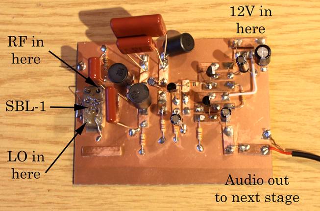 Here is the circuit of the first prototype board, plus the input filter. I’m sure Rick and the ARRL won’t mind me reproducing it bit by bit; after all, anyone can download the whole .pdf at the link above. I’ve actually been a bit clever and incorporated the Input bandpass filter from elsewhere in the article. (Hee hee.) It’s self-explanatory really. The aerial – no, I shan’t call it an antenna, so there! – goes into a tapped coil wound on a toroid, and goes via this symmetrical filter into the Magic Device contained in the Red Box. This is, straight away, is the very heart of the receiver. The SBL-1 has been made for many decades by Mini-Circuits™ of New York, and quite rightly so. It will take in any two signals between 0 Hz and 500 MHz, and mix them perfectly. While being the most expensive component in the receiver, its cost is surprisingly modest. Mini-Circuits™ themselves are happy to supply them at $9.50 apiece, in quantities of 10. http://194.75.38.69/pdfs/SBL-1+.pdf . The LO also goes into the SBL-1, as shown. (We’ll get to the LO later.)