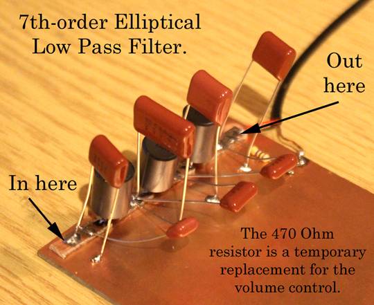 This is a ‘7th-order Elliptical Low Pass Filter’. I have no idea what that really means, apart from it being a darn good low pass filter. That’s why I am a retired jazz musician who seldom got to play the sort of stuff he really wanted to, while KK7M was already in 1992, an academic at Michigan Technological University. Still, this low pass filter is a vital component of Rick’s design. You’ll notice of course that all the condens – capacitors we’re using on these prototype boards all have very long leads, so they look gawky. The reason is, of course, that these boards are merely prototypes. If we snipped off the leads to be neat and tidy, that may hamper us when we come to build the finished version, in which we will use the same caps. It’s not that these are the only capacitors we have; far from it. We bought them in 10 at a time to get them a bit cheaper, and that’s fine, because we can make other receivers later on with them. I suppose it’s because were old, and therefore somewhat parsimonious. Still, that doesn’t matter here; we’re ‘only’ dealing with audio frequencies, so three inches (7.5cm) of leads on a capacitor will have approximately zero effect on the performance. Of course, if we were dealing with UHF or something esoteric like that, I’m sure such long leads would be catastrophic! 8^)