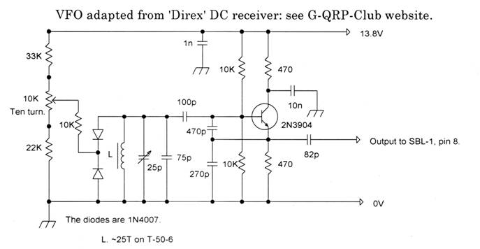 9th January 2016. We thought that today we would receive the LM387s we ordered a few days ago, along with the TIP29C & TIP30C transistors for the power amp. But the postman doesn’t come until about 1100z, so in the meantime attention was turned to our 7 MHz VFO. Yes, even I know you’re not supposed to have a VFO running as high as 7 MHz; but while googling for inspiration, I had found a great little circuit on the G-QRP-Club website, in a DC receiver called the ‘Direx’ – a datasheet of a constructional article by the Rev. George Dobbs G3RJV. Don’t think I’m name-dropping, because I am. (I first met George at 0009z on 1st January 1982 – we were each other’s first QSO on the 10.1 MHz band, which had been released for amateur use nine minutes before. He kindly enclosed a copy of SPRAT, the G-QRP-Club magazine, with his QSL card, and incredible vistas of amateur radio gradually unfolded for us.) (Since we wrote this, George has died. His life-long contribution to the promotion of amateur radio, especially in engaging the interest of younger people, and his tireless promotion of ‘Just build or make something, however simple it is!’ will have inspired hundreds, if not thousands, of recruits to electronics.)