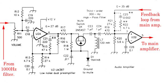 The components shown dotted (C21/R15 and C25/R22) are optional, and will reduce residual hiss, if this proves a problem. The 2N5457 FET in between the two halves of the LM387 will mute the receiver, when grounded, while you are transmitting. It is our intention to build this receiver exactly as it appeared in 1992, but other chips have doubtless appeared in the meantime that are better than the LM387. There are things we’ve come across like the OPA2134, used in hi-fi audio applications; we have ourselves used the NE5532 in a phono. pre-amp.