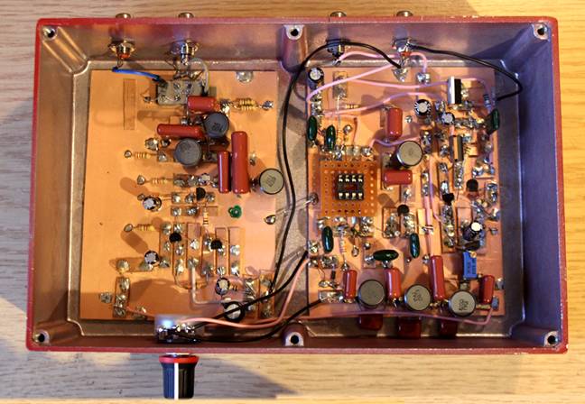 Saturday 16th January 2016. Hurrah! The LM387 arrived. It just looked like any other 8-pin IC, but we danced around the room, cradling it, singing to it, placating & extolling it in a crazy ritual of fulfilment. But would the receiver work? Trembling, we carefully bent the pins so that it would fit the socket. (Why do you always have to do this? Why don’t they come ready to plug in?) Eventually, in it went. All was set up, but a profound silence issued from the loudspeaker. Oh dear. A fresh mug of tea was prepared, and the Crucial Question ‘WHY?’ was asked. Since the entire circuit apart from the SBL-1 is at audio frequency, we injected an AF signal to the final PA. That was OK. The signal was injected into the LM387. That was OK. So was the 1000 Hz filter. So was the initial board; injecting the AF signal at the output of the SBL-1 worked fine, too. So why weren’t there any CW signals? After another mug of tea, we checked the frequency of the LO, and all became clear. Because it was a lash-up VFO, it had no buffer; and when we boxed it & set it up to tune 7.00 to 7.04 MHz, it wasn’t connected to anything. On connecting it to pin 8 of the SBL-1, it was pulled it down about 150 KHz to around 6.85 MHz. And there were no signals there at the time – hence the silence. The VFO was tweaked up to begin at ~7 MHz, and Lo! there were the CW signals, as clear as a bell. Whoopee! We were physically & mentally exhausted by this time, but came back later and recorded this little extract from a contest that was going on. Oddly, it doesn’t sound like a busy contest, though it was, because you can only hear about three stations; on an ordinary DC receiver, you can hear eight or ten; this, of course, is the Ultimate Tribute to Rick Campbell’s superb design.