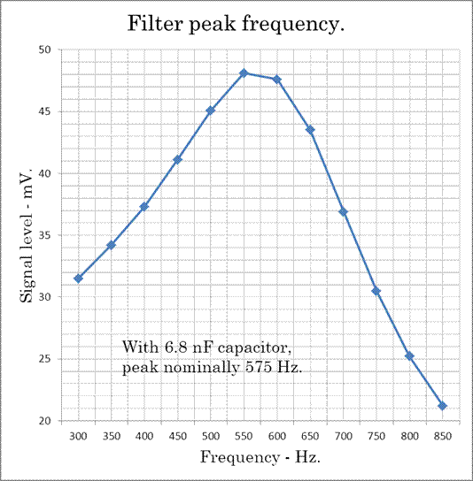 There was only one slight drawback: the centre frequency of ~575 Hz was a little higher than I prefer. Back in the 1980s, one of my main receivers was the venerable (and gorgeous) HRO 5-T, and you could adjust the crystal filter to give you whatever pitch you liked for Morse. We soon decided on about 400 – 450 Hz as our preference. Well: it should be simple enough to lower this filter a little. In spite of all the graphs &c., we aren’t really all that technical, and it was not obvious to us which capacitor needed changing to lower the centre frequency. But after much googling, there was a distinct impression that it was the 6.8 nF from the base of the 2N3094s to deck.