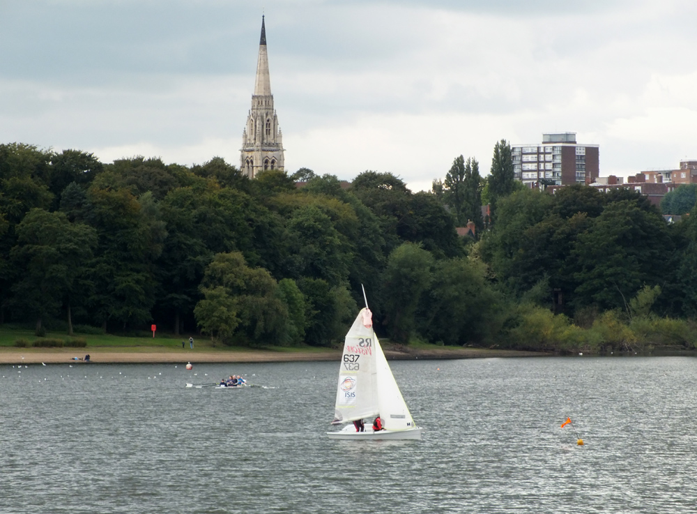 A zoom shot from the dam, juxtaposing a sailing dinghy with the imposing tower & spire of St. Augustine’s Church, Edgbaston. Built in 1868; tower and spire added 1876. Height 56 metres, the tallest in Birmingham. Apparently Pevsner considered the spire overblown & gross…