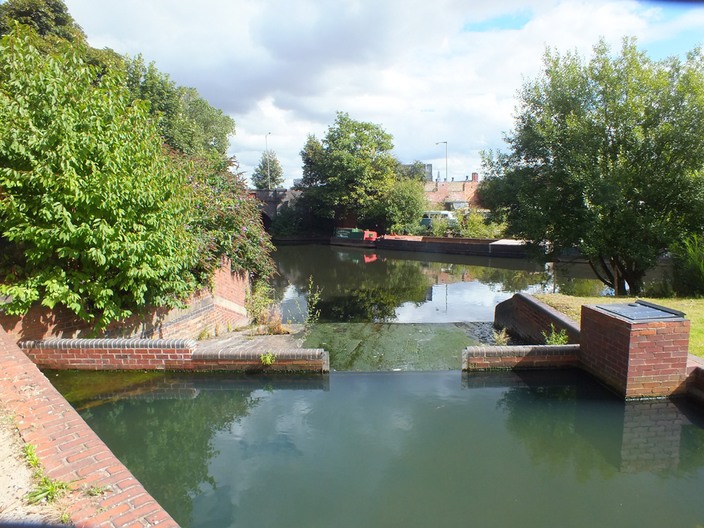 Here is the outlet from the reservoir to the main Birmingham to Wolverhampton level. This is a very long level. Firstly, it extends from the centre of Wolverhampton to the centre of Birmingham; Telford’s improvements by-passed the six locks that went up and down the high bit at Smethwick – though that higher level was left in use – which it still is. From Birmingham, the same level continues along both the Birmingham – Worcester canal and the Stratford canal (which leaves it at Kings Norton Junction) until both the latter are compelled to descend from the ‘Birmingham Plateau’. Distance? Perhaps 20 to 25 miles all on one level? In any event, a fitting tribute to the surveyors & builders of these waterways which are still so valuable to us today.