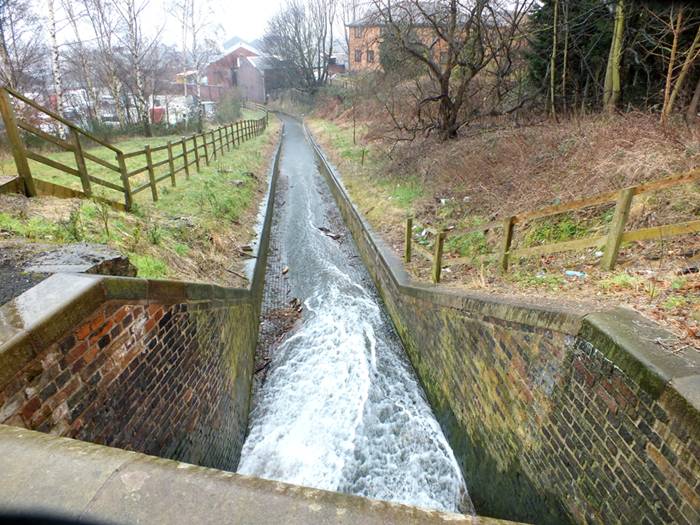 9th February 2014. The overflow is in operation. The water runs down a brick-lined channel.