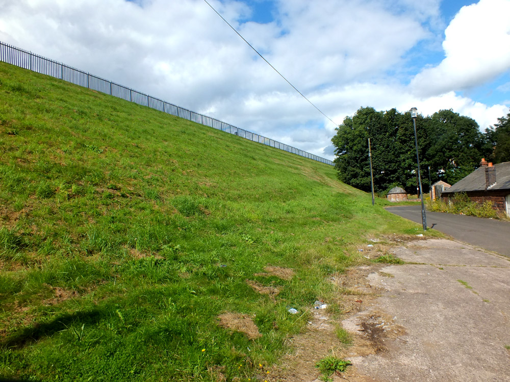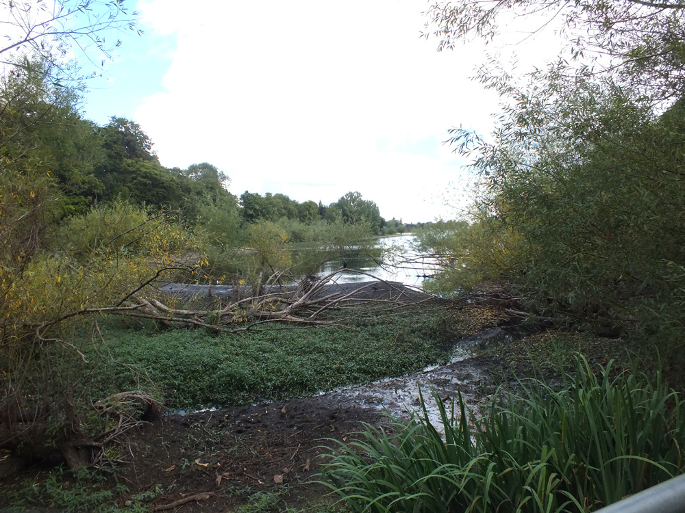 Here is the modest looking escape overflow in September 2013; is it about 6 or 7 metres across. In the event of sufficient rain, the reservoir would fill right up – and the water would escape through this vent.