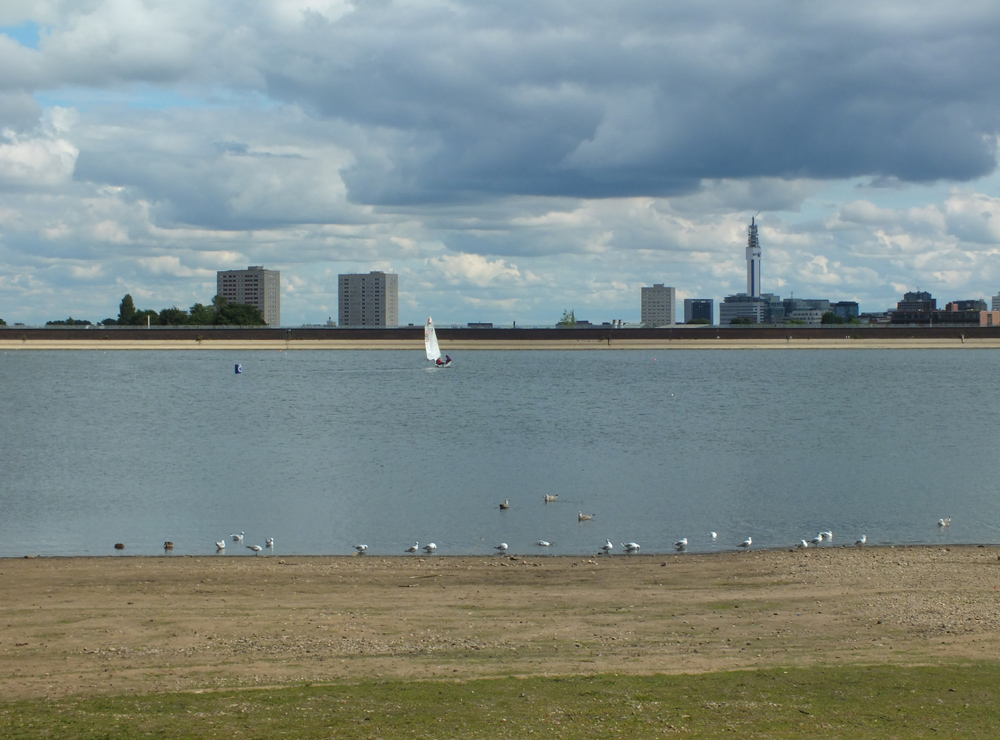 The water level is currently low, as evidenced by the extensive shore-lines visible in these threadbare and abject images. But here is a partial zoom shot which includes just over 20 seagulls, a small sailing dinghy, some of the high-rise stuff in the centre of Birmingham, and most notably, on the right, the Birmingham Post Office tower, which has already figured more than once in this diary. I suppose it might possibly count as ‘The Third Tower’? Tolkien would hardly have approved, though.