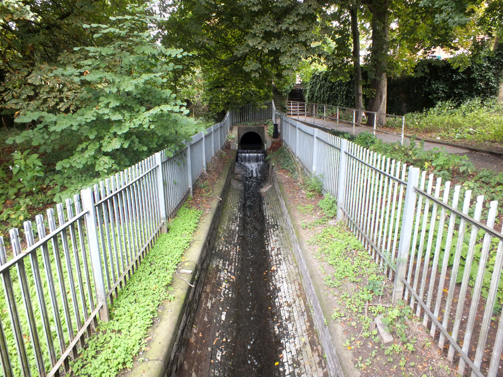 But here it is! The flow is sparse at the moment – we have had but little rain these many weeks; but equally, there must be a sluice or regulating device at the far end. This water is coming from about 3.5 miles away – assuming the conduit is in a straight line. If you wish to know more of the Titford Pools, you can Google it. But as remarked above, click here for images of the Titford Pools and canal, and the start of this feeder. It would seem that those pools were a reservoir for the highest level of James Brindley’s original Birmingham – Wolverhampton canal, circa 1770. In 1830, Telford linked the feeder to his much larger Edgbaston Reservoir, via the conduit you see above. But I may be wrong…