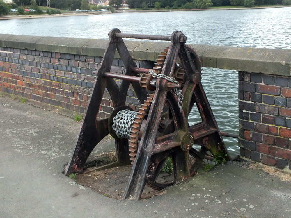 More prosaically, one of the two winches that operate the sluice-gates which allow the water to descend to the canal level. I expect it’s all done automatically these days with large motorized valves &c.; but this is how it was originally done.