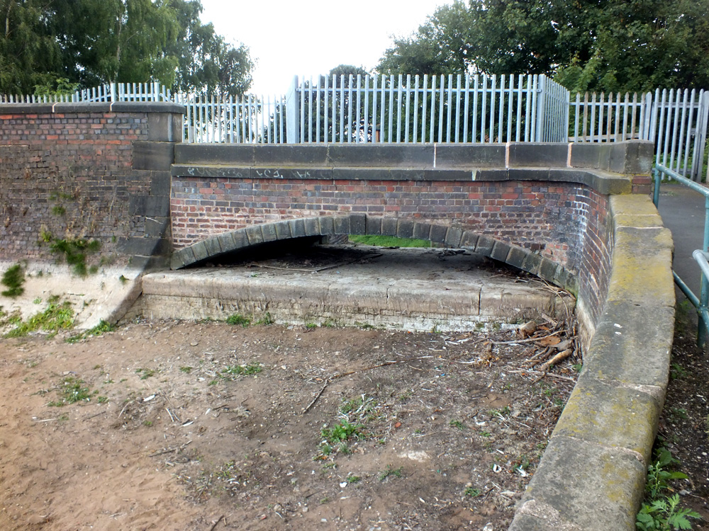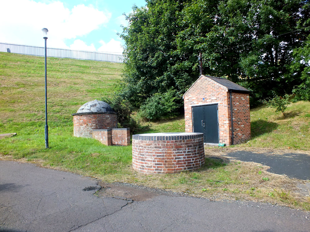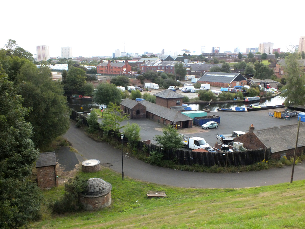 We look down from the dam, and see the curved line of Brindley’s original contour canal. The main area is the Icknield Port Yard, belonging to the recently-created Canal & River Trust, which has taken over the functions of British Waterways. One can join the Trust as an individual member. You will not be surprised, I think, to learn that I am a member? The three structures at the bottom left are doubtless air vents, inspection hatches for the conduit &c. Let us go down & look at them more closely.
