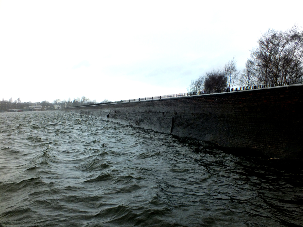 Here is more or less the same view on 9th February 2014. The ‘winter’ of 2013-14 has not yet started; the lowest temperature I have recorded is -1°C, and that only three times, producing a light overnight frost, which soon evaporated. However, there has been prolonged rain and wind, and serious flooding has occurred in many parts of the U.K. with, alas, some loss of life. The weather has been strange indeed for some months. So we went to Edgbaston Reservoir again, in bright and windy weather, to see how much it had filled up. During the short journey, (~15 mins), cloud rolled up and it began to rain. The temperature was 8°C, but there was some sleet in the rain, and by the time we got to the dam, we were getting very wet and very cold in the wind, and were rather glad we had not arrived half an hour earlier and begun to walk round the lake, as originally intended. The reservoir is completely full!