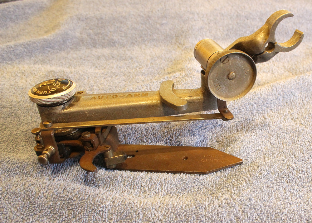 R.I.-Varley (Radio Instruments). Advertised in the Gramophone Magazine in August 1930. This stubby arm is quite clever, because it will track radially. When records are cut, the head is transported in a straight line across the master disc. Yet when we play them back, the usual pick-up arm describes an arc across the disc, causing ‘tracking error’. The head in this unit stays radial. Besides this, it has a buiilt-in automatic stop brake for the turntable, and even an isolating switch to disconnect the pickup – the two terminals, bottom left. Nevertheless, overall, it is not an attractive piece of equipment, resembling more like a mediaeval instrument of torture… 🤔)