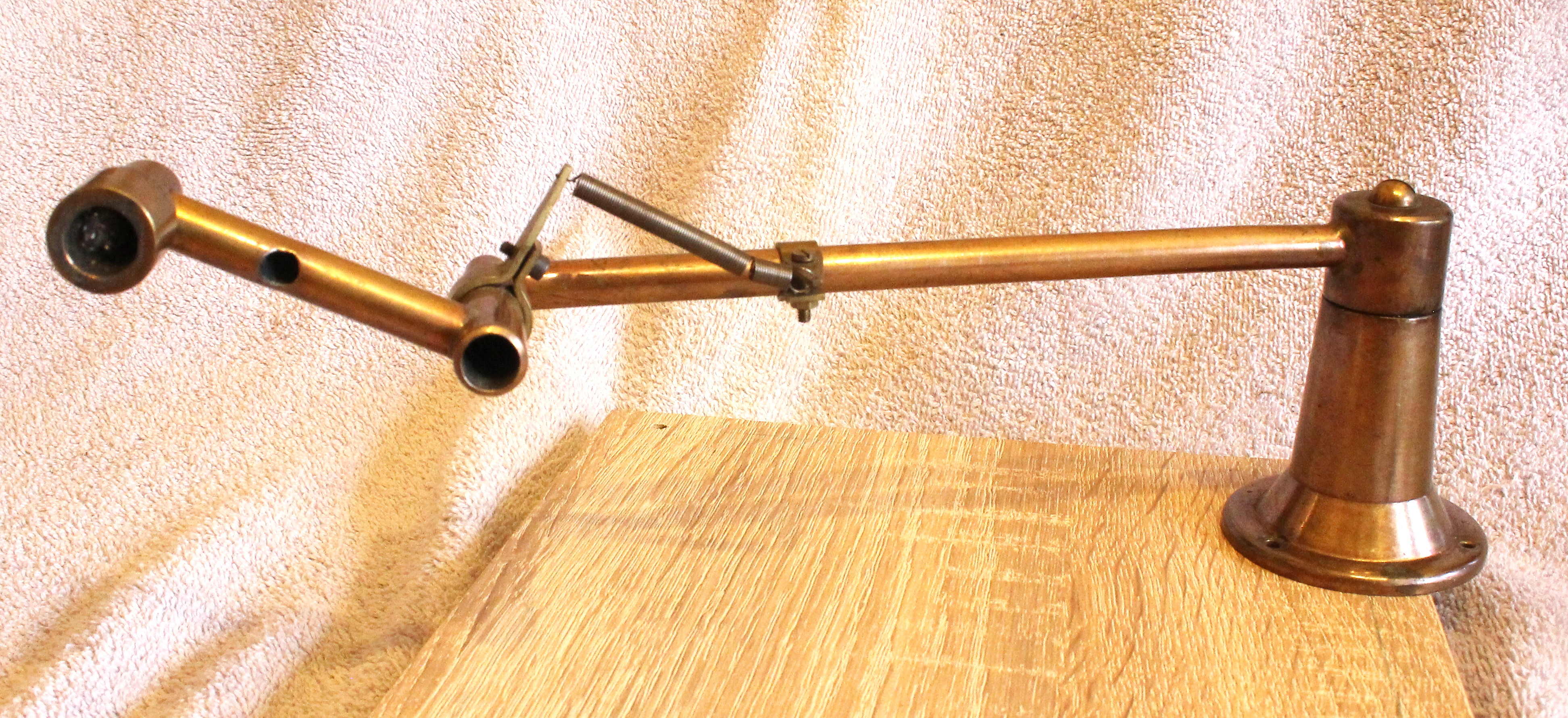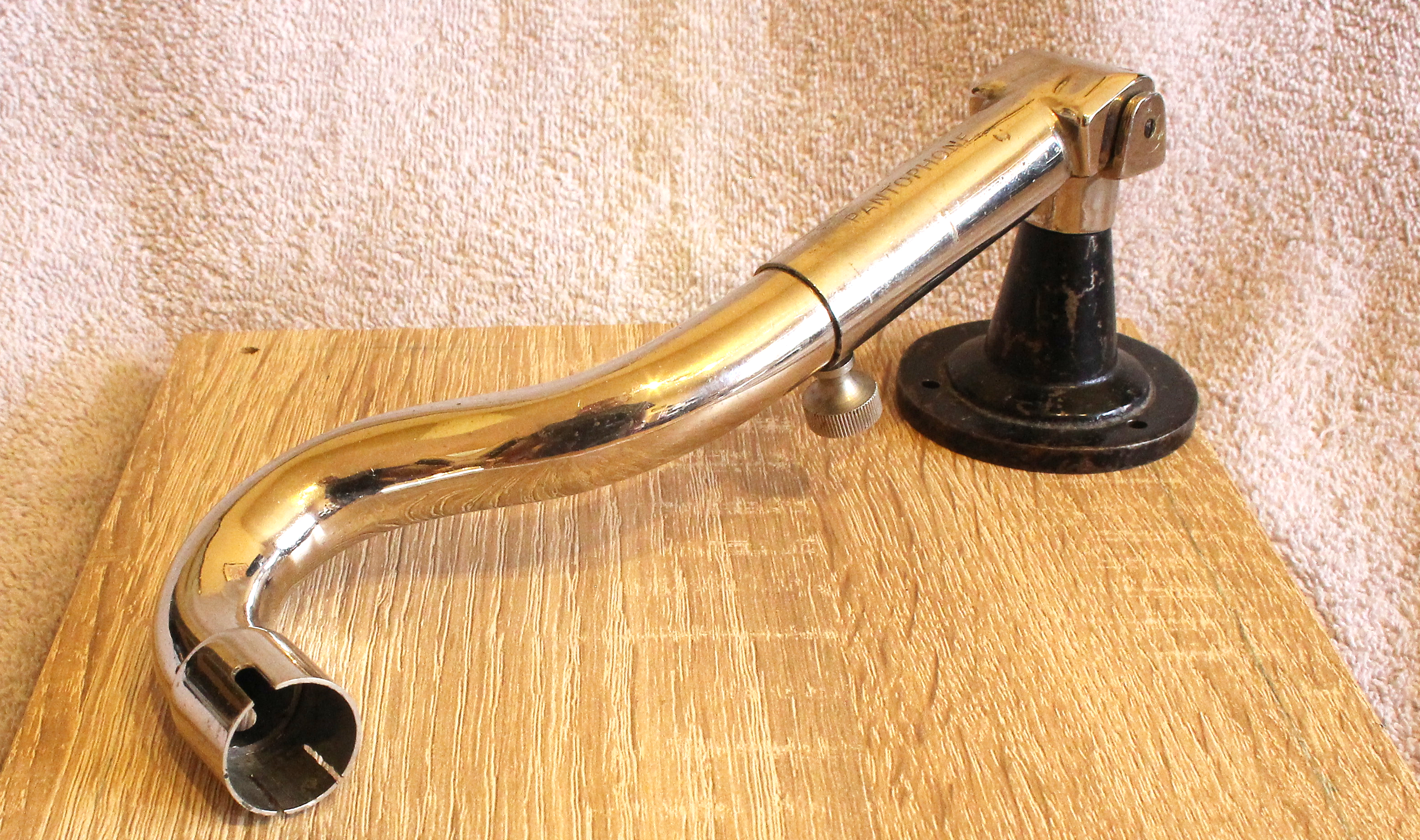 Pantophone. Made in Germany, but advertised here in the Gramophone Magazine in January 1931. At first glance it looks like the tone arm of a mechanical gramophone – but there is no path for the sound to pass through the black bearing boss. 1931 seems rather late for something of this sort, but it could easily have originated several years before. Interestingly, the socket at the front of the arm was angled upwards by several degrees. The corresponding Pantophone pick-up may have had a similar angle, downwards; if so, the intent was to discourage the use of other makes of pickup. (I have jiggered it so that it will take most tangential types of head. 😊)