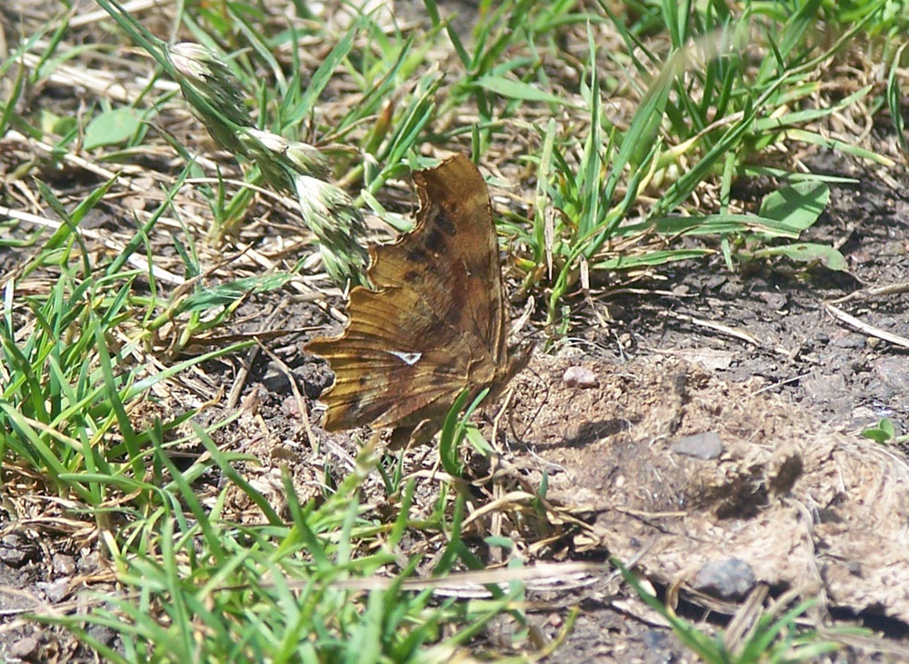 So was the Comma, Polygonia c-album, though I could not get a shot of an upperside. These Commas fly in a fast, assured, almost reckless fashion. I once found a butterfly at the bathroom window in my old house trying to get out. ‘Ah: a Small Tortoiseshell as usual’, I thought, and enclosed it in my hand to let it out. A Small Tortoiseshell will normally become quiescent at this, or flap feebly a couple of times. Not this one: it went FFRRRRRRR!!! in my hand while I was opening the window. Therefore knowing it was something different, I only made a small aperture between my thumb & forefinger so that I could see what it was when it came out. It prised itself through this aperture in an irritable fashion, as if saying: ‘See what I have to put up with!’ But at least I had time to see it was a Comma, before it zoomed off. The white mark on the underside of this one is more like a triangle than a comma. Moreover, it is extracting (or attempting to extract) useful nutrients, presumably nitrogenous, from a dried piece of horse manure, probably also in an irritable fashion. The weather has been very dry so far this year… Perhaps the Comma is the nearest thing we have to a ‘stroppy’ butterfly? 8^)