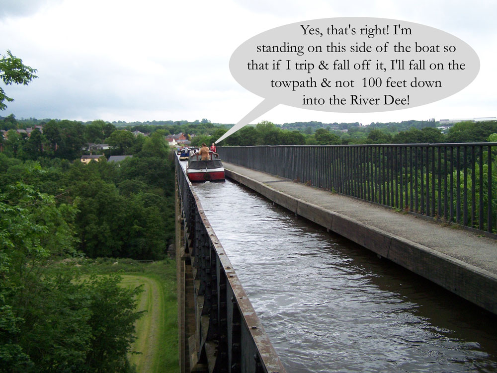 One minor point of note: you’ll see in this photo. that the towpath ‘sticks out’ from the side of the channel, over the water. This is to allow the water ‘to get past the boat’. The first such cast-iron aqueduct to be built – which was very much smaller of course – had no provision for this; it just had a minimal clearance around the boat. Accordingly, the horse used for towing the narrow-boat could hardly draw the boat forward against the pressure of the water, which was sort of ‘piling up’ against the front of the boat. This was duly noted and taken into account with subsequent aqueducts, such as Pontcysyllte.