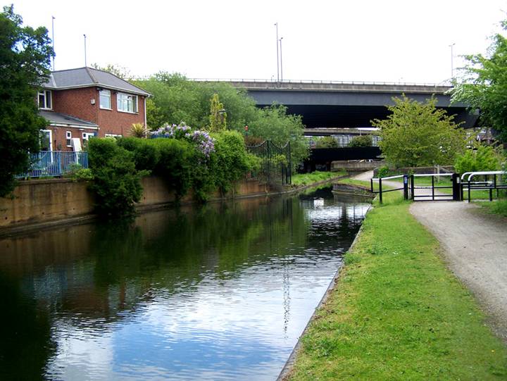 Here, we are approaching the junction from Birmingham; from the south west. The M6 – which is elevated on concrete piles – is seen in the distance. On the left is a canal. This is the Birmingham & Fazeley Canal, completed in 1789. Its origin is in central Birmingham. On the right, at a lower level, is the River Rea. This rises in the Waseley Hills, some miles to the south west of Birmingham. It was brick-culverted many years ago, as it was prone to flood after prolonged heavy rain. Why are these two ‘watercourses’ headed in the same direction?