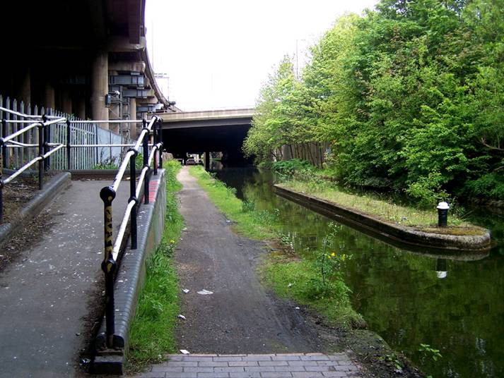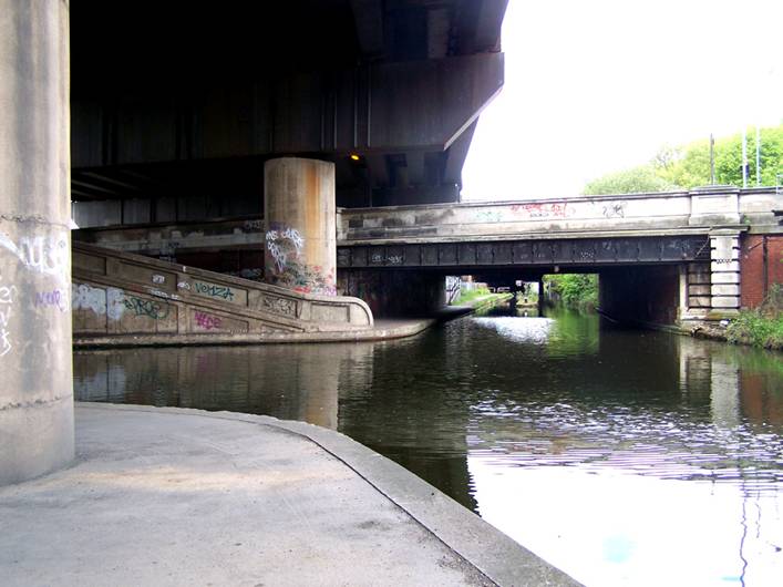 There is more than one ‘confluence’ under Spaghetti Junction. Here, dwarfed and oppressed by the megalithic pillars supporting the M6, is the junction of the Birmingham and Fazeley Canal (coming in at the left and turning sharp right), with the Tame Valley Canal coming in straight towards us, from the west. This is a relatively recent canal, as attested by its direct line, its many embankments and bold earthworks. If you have even been queuing in the interminable traffic where the northbound M5 meets the M6, you will have passed under the Tame Valley canal; which, in its light and unassuming aqueduct, casually steps over the M5, some miles to the west of the above shot.