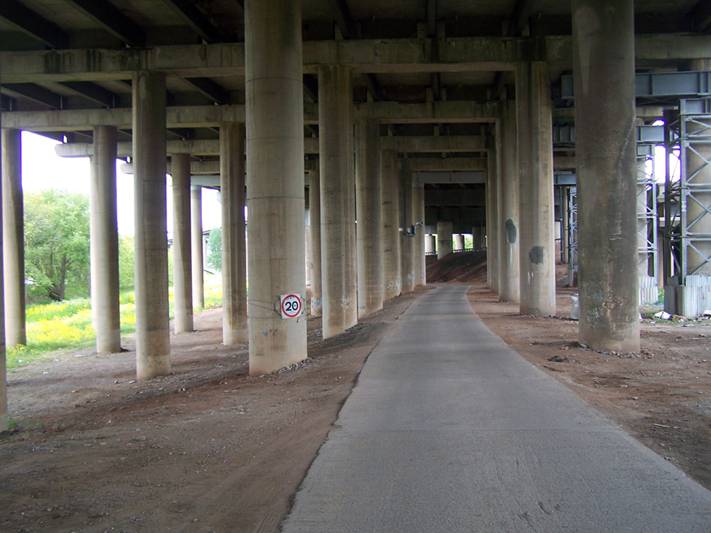 15th May, 2010. We sallied forth for some fresh air. It was largely a dull day; but we were undaunted in our Quest. This was simply to take some photos. underneath Spaghetti Junction. This unlovely name (it can only have been created by a local journalist) was bestowed on a complicated motorway junction on the M6, which connects it to the centre of Birmingham. It goes without saying, that it (along with other nearby junctions in the West Midlands) is a notorious traffic bottleneck. Indeed, a by-pass – the ‘M6 Toll’ – was constructed some years ago to enable people, on payment of a fee, to get round this whole area. But I digress. The purpose of this web page is simply to furnish you with a few images of what is underneath this junction. On the aerial view above, the M6 runs from the upper left to the lower right, and the A38(M) runs off to the lower left into the centre of Birmingham. It just looks like some roads. But it is much more complicated (& interesting) than that!