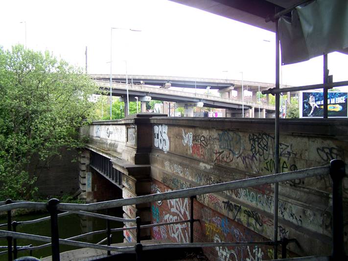 A view underneath old Salford Bridge, with the Birmingham & Fazeley canal aqueduct in the distance, and a single mighty pillar of the M6.